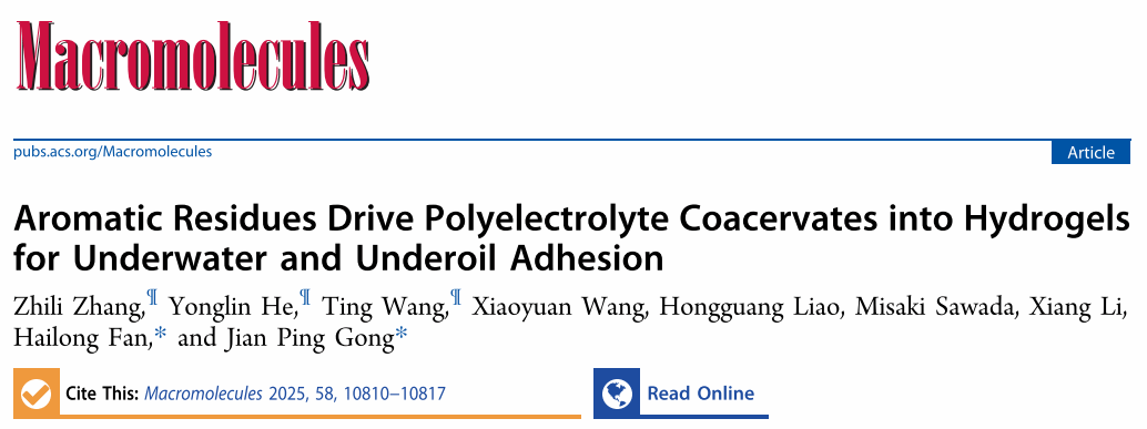 Recently, Dr. Hailong Fan, a newly appointed Associate Professor at our college, has made significant progress in the field of underwater adhesive materials. Inspired by the amino acid sequences of intrinsically disordered proteins (IDPs) found in natural phase-separated systems, his team developed a coacervate material capable of undergoing spontaneous liquid–liquid phase separation (LLPS) and phase transition without external stimuli. This material demonstrates exceptional underwater adhesion and remains stable in oil environments. The related research has been published in Macromolecules. Prof. Hailong Fan and Prof. Jian Ping Gong from Hokkaido University are the co-corresponding authors, and the College of Chemistry and Environmental Engineering at Shenzhen University is the first affiliated institution.