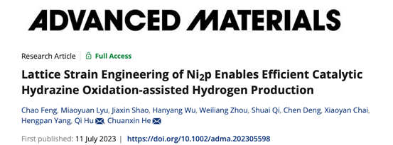 Recently, distinguished professor Chuanxin He of the College of Chemistry and Environmental Engineering, Shenzhen University published the latest research progress on 《 Advanced Materials 》 (IF:29.4, JCR Chemistry Region 1, TOP Journal). The title is 《Lattice Strain Engineering of Ni2P Enables Efficient Catalytic Hydrazine Oxidation-assisted Hydrogen Production》. The first author of this paper is Chao Feng, a postdoctoral researcher, and Miaoyuan Lyu, a postgraduate student, and the corresponding author is Chuanxin He distinguished professor and Qi Hu associate professor. College of Chemistry and Environmental Engineering of Shenzhen University is the corresponding unit.