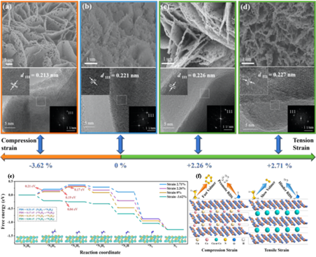 Lattice strain engineering has emerged as an effective and versatile strategy to enhance electrocatalytic activity of various electrocatalysts including precious and non-precious metal-based electrocatalysts due to its powerful capacity for tuning binding energies of reaction intermediate. The continuously modulating of lattice strains of non-precious metal-based electrocatalysts may also flexibly tune the adsorption strength with reaction intermediates of the HzOR and HER for reaching the vertex of adsorption “volcano plot”. However, the related studies are still few and limited in scope.