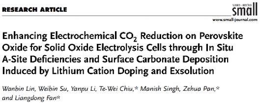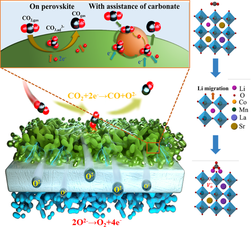 With the rapid development of modern society, the energy demand is increasing day by day. The excessive use of traditional fuels has caused a large amount of greenhouse gas, like carbon dioxide (CO2), emissions. New energy sources such as solar energy and wind energy are limited by their instability and other issues. Using the excess electricity of new energy to convert CO2 into other combustible gases is an effective solution for making full use of new energy and reducing emissions. Solid oxide electrolysis cells (SOECs) have attracted the attention of many researchers and have been applied in the electrolysis of CO2, due to their high conversion efficiency and favorable thermodynamic conditions. The research paper titled "Enhancing Electrochemical CO2 Reduction on Perovskite Oxide for Solid Oxide Electrolysis Cells through In Situ A-Site Deficiencies and Surface Carbonate Deposition Induced by Lithium Cation Doping and Exsolution" was recently published in the international journal Small (impact factor 15.153) by postgraduate student Lin Wanbin, and co-author Dr. Fan as main corresponding author. This work reports a method to improve the performance of catalytic reduction of CO2 by lithium modifying the perovskite La0.55Li0.05Sr0.4Co0.7Mn0.3O3-δ. The experimental and theoretical calculation results prove that the doping of Li can increase the oxygen vacancy concentration of the material and change the chemical environment of B-site ions. At the same time, lithium carbonate formed by the in-situ exsolution of Li in a high-temperature CO2 environment can serve as a new catalytic adsorption site for CO2, helping the adsorption and activation of carbon dioxide. The assembled SOEC cell La0.55Li0.05Sr0.4Co0.7Mn0.3O3-δ|LSGM|LSCF at 800 oC, 1.5V with pure CO2 showed improved performance over that of the undoped unmodified electrolytic cell, close to 30%, and the electrolytic cell can run stably for more than 300 hours. The results confirm that lithium doping is a feasible new strategy to enhance the CO2 catalytic performance of perovskite oxide cathodes.