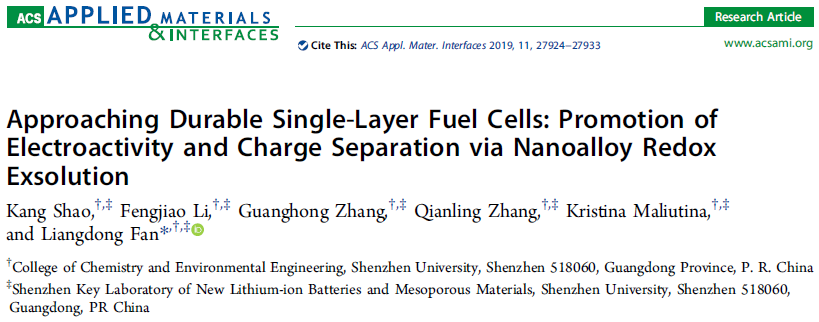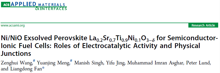 The paper entitled "Approaching Durable Single-Layer Fuel Cells: Promotion of Electroactivity and Charge Separation via Nanoalloy Redox Exsolution" was published in the international journal ACS Applied Materials & Interfaces (impact factor 9.229). Co-authored by Prof. Dr. Fan and master student Shao Kang, with Shenzhen University as the first author affiliation and sole correspondent, this work has been cited 61 times so far. Fan's research group used the metal/oxide-perovskite oxide composite materials, constructed by epitaxial growth, for new ceramic fuel cells, also known as single-layer fuel cells or semiconductor-ion fuel cells. This work takes advantage of the stable redox structure of the perovskite material itself and combines it with the in situ exsolution of metal nanoparticles to construct a metal-perovskite semiconductor heterojunction. The latter achieved the effect of "killing two birds with one stone" in an efficient and stable fuel cell by improving the catalytic oxygen reduction and hydrogen oxidation reaction rates while constructing a generalized scale p-n junction and Schottky junction. The latter effectively alleviates the internal short circuit problem of the semiconductor "electrolyte", stabilizes the performance of the single cell to a certain extent, and achieves efficient and stable fuel cells. This work provides a methodological reference for the efficiency and stable operation of novel fuel cells and for understanding their corresponding working principles. Based on this work, Wang Zenghui, a postgraduate student of the research group, and Dr. Meng Yuanjing as the co-first authors, and Dr. Fan as the corresponding author, published a paper on "Ni/NiO exsolved perovskite La0.2Sr0.7Ti0.9Ni0.1O3−δ for semiconductor-ionic fuel cells: Roles of electrocatalytic activity and physical junctions" on ACS Applied Materials & Interfaces (Impact factor 10.383). In this work, an extra-functional catalytic layer was added to the anode, combined with feasible perovskite surface stripping and functional catalytic energy reduction to construct a metal-perovskite semiconductor heterojunction from the microscopic and macroscopic (bulk) scales. This significantly improved the catalytic performance and charge separation efficiency, resulting in a maximum power density of the corresponding semiconductor ion fuel cell that is more than an order of magnitude higher than that of the unmodified cell.