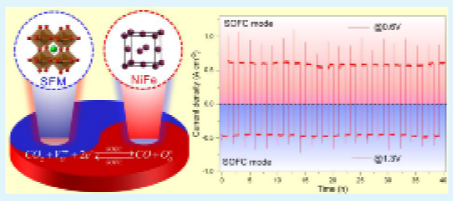 Based on the above work, Dr. Fan’s research group epitaxially grew NiFe alloy on the surface of perovskite oxide for efficient and reversible CO2/CO conversion in reversible solid oxide cells. The research paper entitled "Mutual Conversion of CO–CO2 on a Perovskite Fuel Electrode with Endogenous Alloy Nanoparticles for Reversible Solid Oxide Cells" was published in the international journal ACS Applied Materials & Interfaces, and it has been cited 31 times so far. The paper was led by Li Yihang and Dr. Fan of Shenzhen University. This work reports the material Sr1.97Fe1.5Mo0.5Ni0.1O6−δ (SFMN). The assembled SFMN/ /SDC//LSGM//LSCF-SDC single cell achieved the highest power density of 443 mW cm−2 and current density of -0.877 A cm−2 (1.46V) at 800 oC under fuel cell, and electrolytic cell modes, respectively. The performance of SFMN is superior to that of the original material Sr2Fe1.5Mo0.5O6−δ and the traditional Ni-YSZ electrode. Moreover, it exhibits excellent anti-coking potential and realizes stable operation of 20 cycles of reversible SOFC/SOEC within 40 hours. Hence, this work provides a feasible scheme to design highly active and stable fuel electrodes for reversible solid oxide cells.