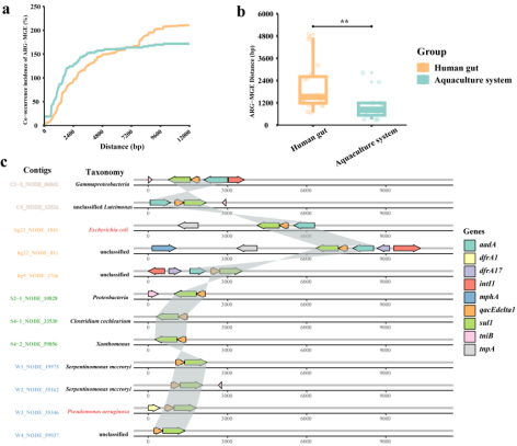 The co-occurrence pattern of ARGs and mobile genetic elements (MGEs) based on contigs. a: The co-occurrence incidence of ARG and MGE. The x-axis means the distance of ARG-MGE, and the y-axis means the co-occurrence incidence. With the increase of distance, the co-occurrence rate also increases and gradually reaches a peak. b: The shortest distance of ARG-MGE in the human gut and aquaculture system (** p < 0.01 indicates significant difference). c: Gene arrangement patterns of sul1-qacEdelta1 and neighborhood genes in different sample groups. Different colored contigs belong to different sample groups, and the taxonomy names colored in red indicate pathogenic bacteria.