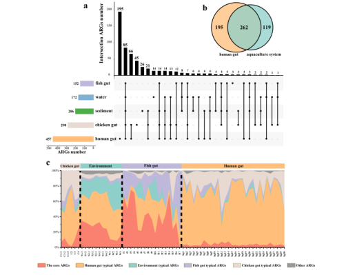 The core ARGs in aquaculture system. a: UpSet diagram shows the number of ARGs shared and unique between different sample groups. Solid black points indicate ARGs occurrence in this sample group, and points linked by lines indicate ARGs shared by different sample groups. The bar chart on the top shows the number of ARGs unique or shared by sample groups, and the bar chart on the left shows the total number of detected ARG subtypes. b: The Venn diagram shows the number of ARGs shared by the human gut and aquaculture system. c: The percent stacked histogram shows the composition of typical and core ARGs (indicated by different colors). Human gut and environment typical ARGs defined as ARGs detected in all human gut and environment samples (fishpond sediment and water samples) respectively.