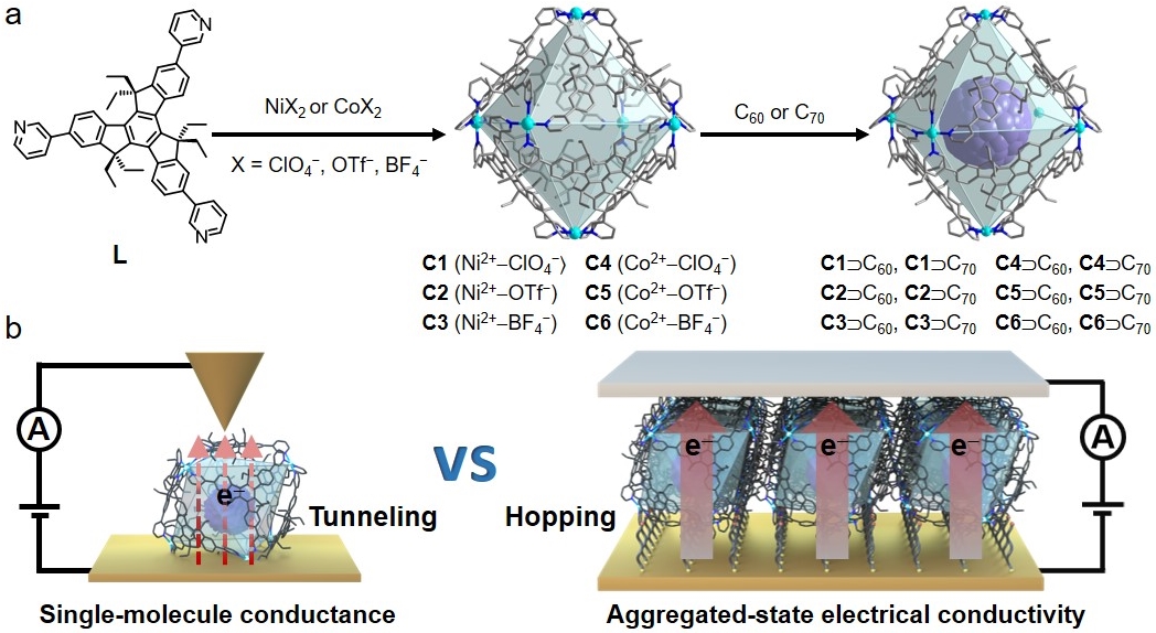 The metallo-cages and the cage-fullerene complexes are comprehensively characterized by electrospray ionization-mass spectrometry (ESI-MS), traveling wave ion mobility-mass spectrometry (TWIM-MS), single-crystal X-ray diffraction (SCXRD), and nuclear magnetic resonance (NMR) spectroscopy. Significantly, the encapsulation of fullerene notably enhances the structural stability of metallo-cages, thereby enabling the systematical study of electrical conductivity at both single-molecule level and aggregated state.