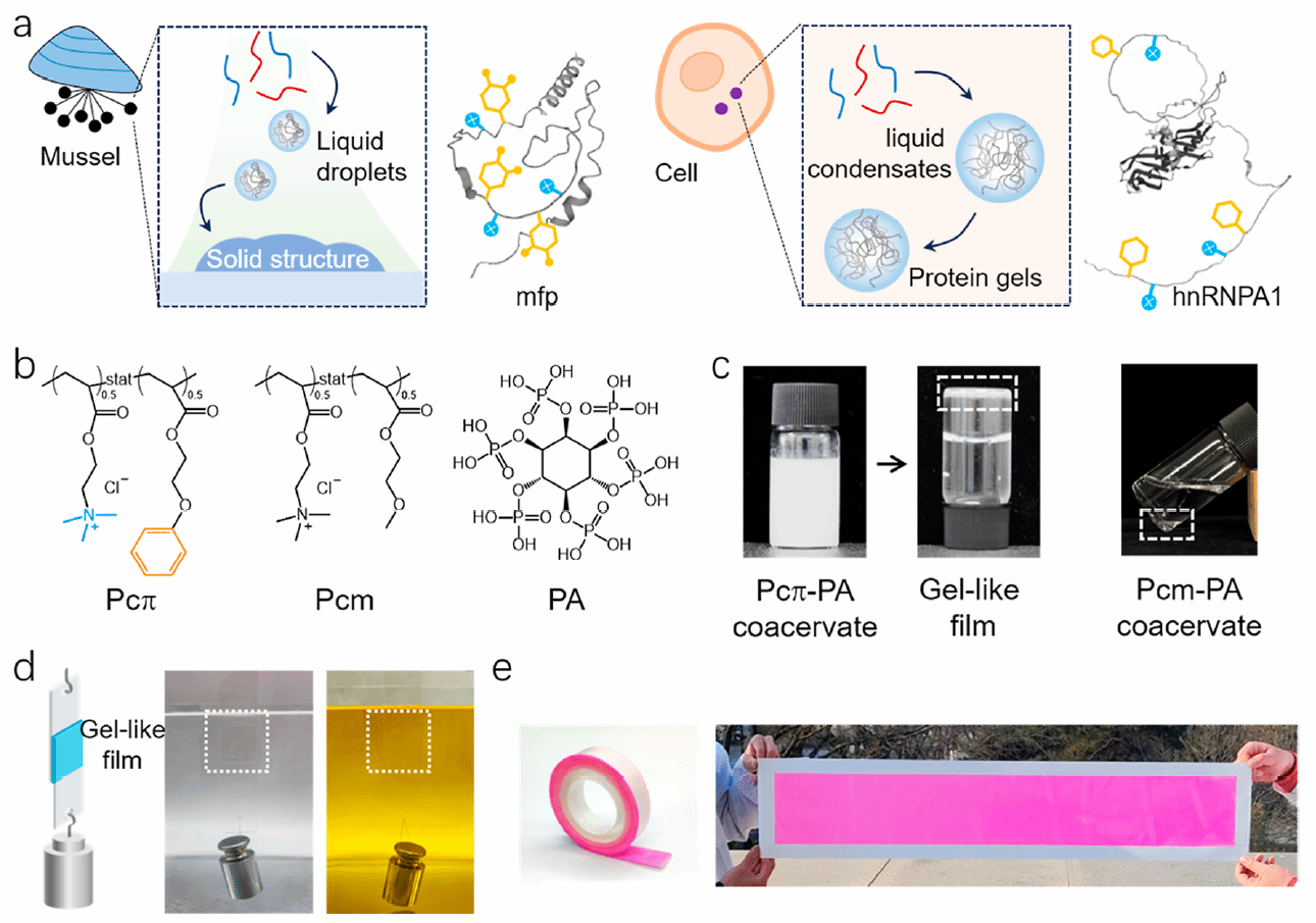 Recently, Dr. Hailong Fan, a newly appointed Associate Professor at our college, has made significant progress in the field of underwater adhesive materials. Inspired by the amino acid sequences of intrinsically disordered proteins (IDPs) found in natural phase-separated systems, his team developed a coacervate material capable of undergoing spontaneous liquid–liquid phase separation (LLPS) and phase transition without external stimuli. This material demonstrates exceptional underwater adhesion and remains stable in oil environments. The related research has been published in Macromolecules. Prof. Hailong Fan and Prof. Jian Ping Gong from Hokkaido University are the co-corresponding authors, and the College of Chemistry and Environmental Engineering at Shenzhen University is the first affiliated institution.