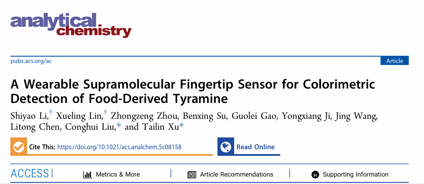 Recently, Shiyao Li and Xueling Lin from the College of Chemistry and Environmental Engineering, Shenzhen University, published a research paper as co-first authors in the Nature Index journal Analytical Chemistry (Impact Factor: 6.7; CAS JCR Q1; TOP journal). The paper is entitled “A Wearable Supramolecular Fingertip Sensor for Colorimetric Detection of Food-Derived Tyramine”. The study was completed under the joint supervision of Assistant Professor Conghui Liu and Associate Professor Tailin Xu, who served as co-corresponding authors.