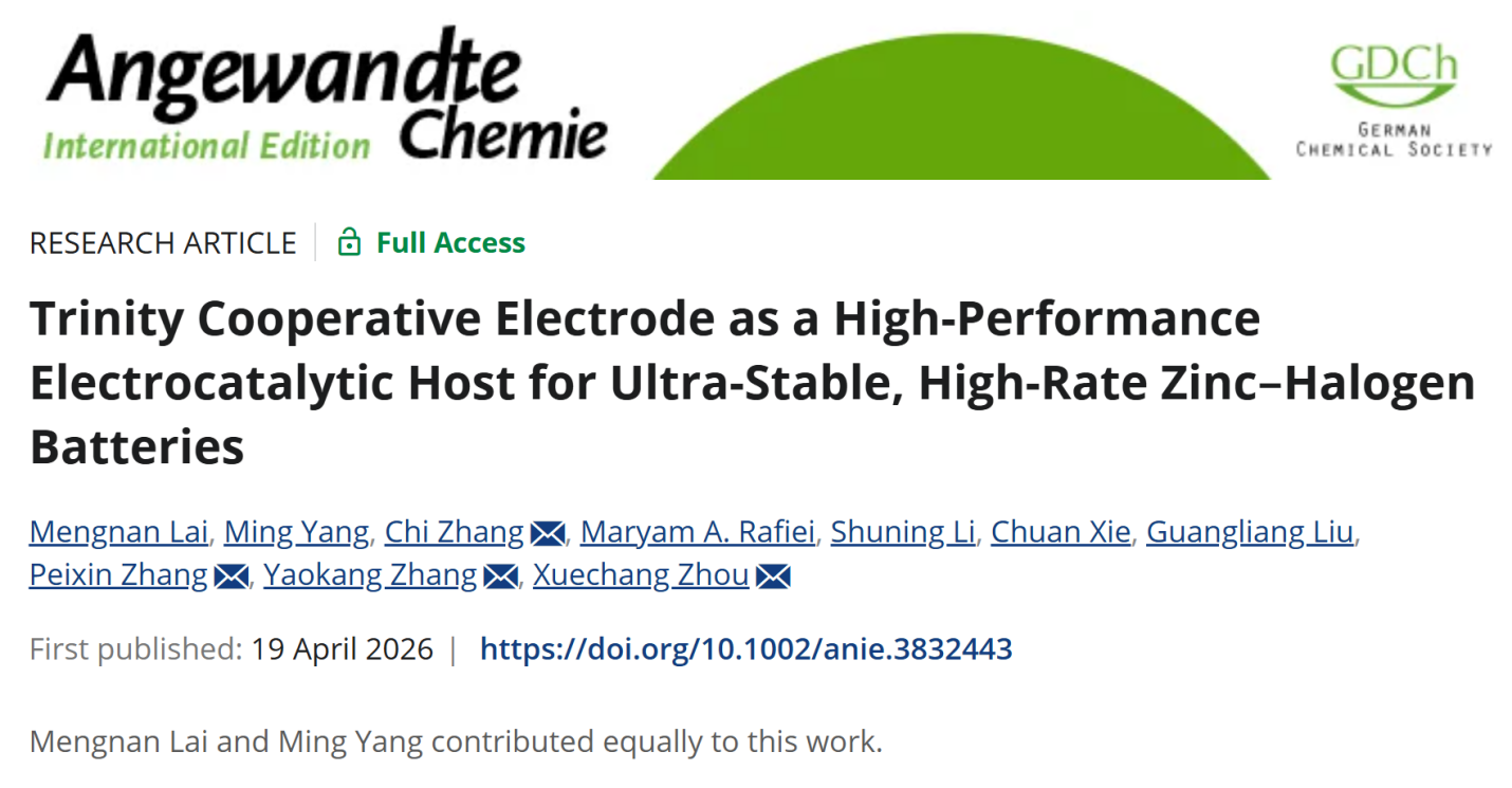 论文信息:Mengnan Lai#, Ming Yang#, Chi Zhang*, Maryam A. Rafiei, Shuning Li, Chuan Xie, Guangliang Liu, Peixin Zhang*, Yaokang Zhang*, Xuechang Zhou*. Trinity Cooperative Electrode as a High-Performance Electrocatalytic Host for Ultra-Stable, High-Rate Zinc–Halogen Batteries, Angewandte Chemie International Edition, 2026. https://doi.org/10.1002/anie.3832443