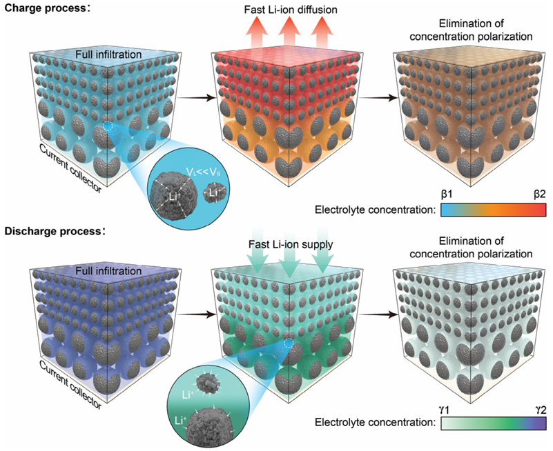 在该项工作提出了一种创新的双层电极结构设计。通过采用不同尺寸的LiNi0.83Mn0.12Co0.05O2(NMC83)材料构建双层电极结构,其中底层由大颗粒(11.3 μm),顶层由小颗粒(4.5 μm)组成,在经过充分浸润后,电极内部电解液浓度分布均匀。在充电过程中,由于锂离子扩散速度差异(VL<<VS),充电开始时小颗粒中的锂离子快速扩散到电解液中,而大颗粒中的锂离子扩散速度相对较慢。因此,电极内部形成浓度梯度,小颗粒附近的电解液中锂离子浓度高,大颗粒附近的电解液中锂离子浓度低。不过,小颗粒与电解液充分接触,根据菲克定律,高浓度的锂离子能够快速扩散到电解液中,充电过程中消除了浓差极化。这种创新的双层电极结构设计,构建了快速的电解液浸润和锂离子扩散通道,有效缓解了厚电极中的浓差极化问题。