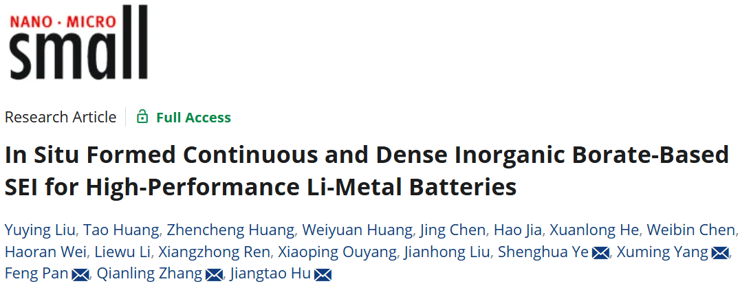 4. 深圳大学化学与环境工程学院张黔玲教授团队在材料领域顶尖期刊《Small》(影响因子13.0,中科院JCR 2区,TOP期刊)发表了题为《In Situ Formed Continuous and Dense Inorganic Borate-Based SEI for High-Performance Li-Metal Batteries》的研究论文。该团队硕士研究生刘钰滢为论文第一作者,深圳大学张黔玲教授、胡江涛副教授、杨旭明助理教授、叶盛华研究员,北京大学潘锋教授为该论文共同通讯作者,深圳大学为第一作者单位和第一通讯单位。