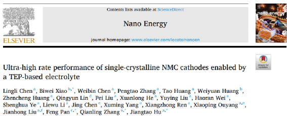 2. 深圳大学化学与环境工程学院张黔玲教授团队在材料领域顶尖期刊《Nano Energy》(影响因子16.8,中科院JCR 1区)发表了题为《Ultra-high rate performance of single-crystalline NMC cathodes enabled by a TEP-based electrolyte》的研究论文。该团队硕士研究生陈伶俐为论文第一作者,深圳大学张黔玲教授、胡江涛副教授、北京大学潘锋教授、有研(广东)新材料技术研究院肖必威教授为该论文通讯作者,深圳大学为第一作者单位和第一通讯单位。