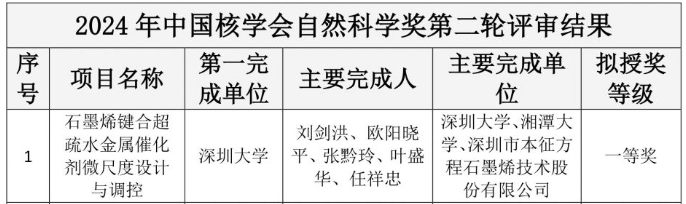 为表彰在中国核科学基础理论研究中做出重大贡献者,中国核学会近日按照《中国核学会科学技术奖奖励办法》开展科学技术奖评审工作,深圳大学化学与环境工程学院刘剑洪教授、张黔玲教授团队的《石墨烯键合超疏水催化剂微尺度设计与调控》项目荣膺中国核学会自然科学奖一等奖,深圳大学为第一完成单位。