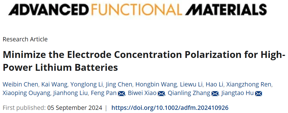 1. 深圳大学化学与环境工程学院张黔玲教授团队在材料领域顶尖期刊《Advanced Functional Materials》(影响因子18.5,中科院JCR 1区)发表了题为《Minimize the Electrode Concentration Polarization for High-Power Lithium Batteries》的研究论文。该团队硕士研究生陈伟彬和中山大学王凯为论文共同第一作者,深圳大学胡江涛副教授、张黔玲教授、有研(广东)新材料技术研究院肖必威教授北京大学潘锋教授为该论文通讯作者,深圳大学为第一作者单位和第一通讯单位。