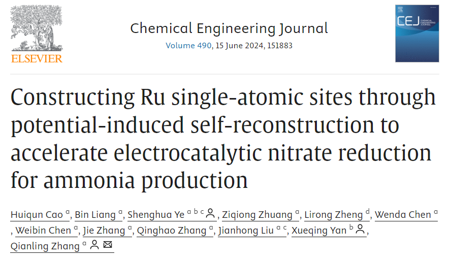 3、深圳大学张黔玲教授团队在期刊《Chemical Engineering Journal》上发表题为《Constructing Ru single-atomic sites through potential-induced self-reconstruction to accelerate electrocatalytic nitrate reduction for ammonia production》的研究论文,深圳大学曹慧群副教授和硕士研究生梁彬是共同第一作者,深圳大学叶盛华研究员、张黔玲教授和北京大学颜学庆教授为共同通讯作者。