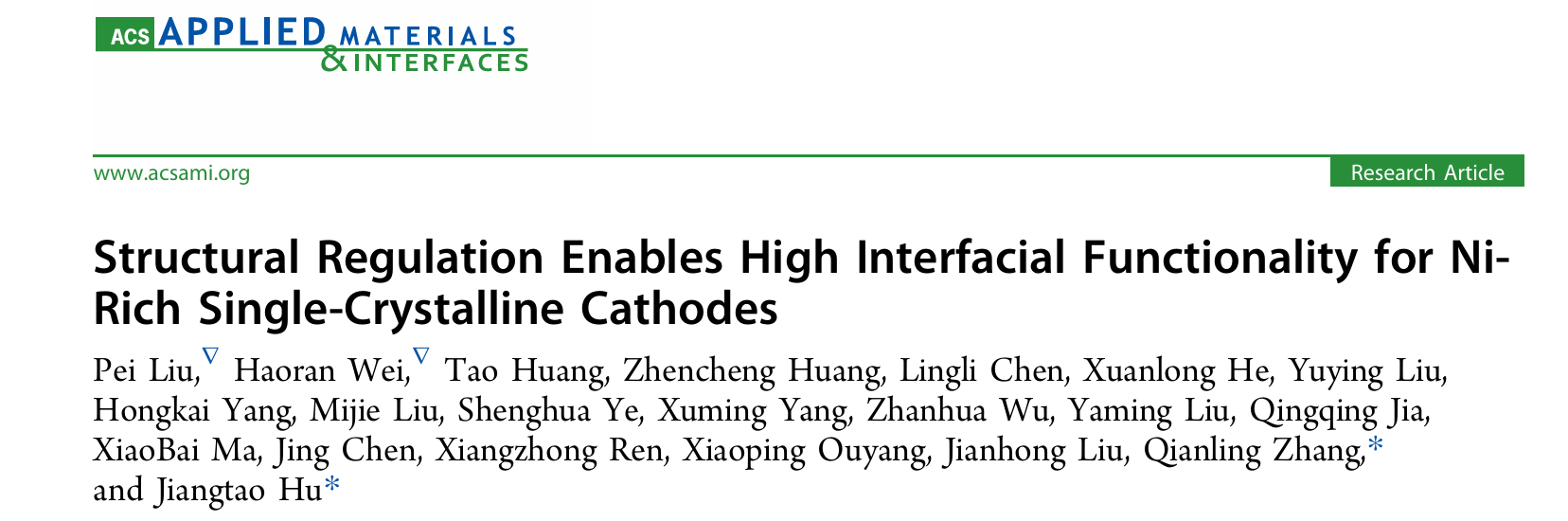 7. 深圳大学化学与环境工程学院张黔玲教授团队在期刊《ACS Applied Materials & Interfaces》(影响因子8.3,中科院JCR2区,TOP期刊)上发表了题为《Structural Regulation Enables High Interfacial Functionality for Ni-Rich Single-Crystalline Cathodes》的论文。该团队硕士研究生刘珮和魏浩然为共同第一作者,张黔玲教授和胡江涛副教授为共同通讯作者。深圳大学为唯一作者单位和唯一通讯单位。