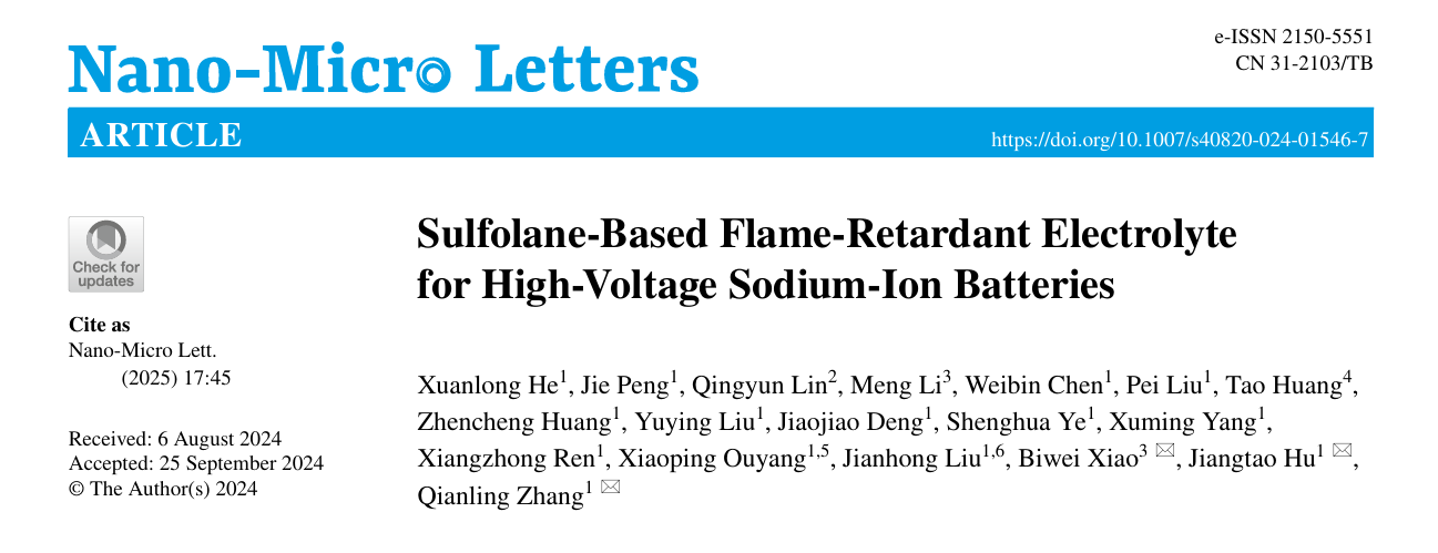 3. 深圳大学化学与环境工程学院张黔玲教授团队在材料领域顶尖期刊《Nano-Micro Letters》(影响因子31.6,中科院JCR 1区,TOP期刊)发表了题为《Sulfolane‑Based Flame‑Retardant Electrolyte for High‑Voltage Sodium‑Ion Batteries》的研究论文。该团队硕士生何铉龙为论文第一作者,深圳大学张黔玲教授、胡江涛副教授、有研(广东)新材料技术研究院肖必威教授为该论文共同通讯作者,深圳大学为第一作者单位和第一通讯单位。
