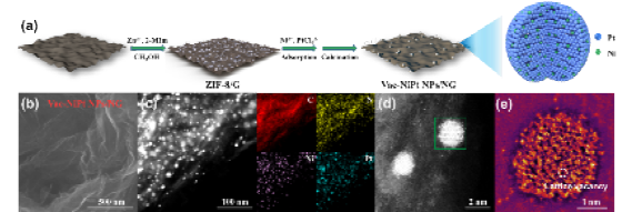 该工作以石墨烯为导电基底负载低载量铂纳米颗粒,并采用异质原子掺杂和缺陷工程策略,在铂颗粒上进行镍掺杂并且同时构建原子尺度缺陷,在铂颗粒上同时引入配体效应与应变效应。实验结果表明,配体效应提升了铂颗粒的ORR催化活性,应变效应有效提高了催化剂的及一氧化碳和甲醇的耐受性能。