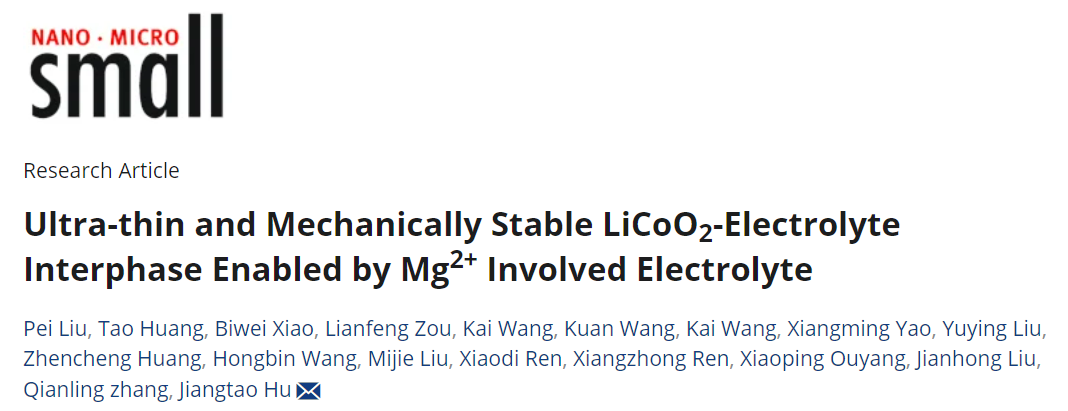 5. 深圳大学化学与环境工程学院张黔玲教授团队在材料领域顶尖期刊《Small》(影响因子13.0,中科院JCR2区,TOP期刊)发表了题为《Ultra-thin and Mechanically Stable LiCoO2-Electrolyte Interphase Enabled by Mg2+ Involved Electrolyte》的研究论文。该团队硕士研究生刘珮和黄涛为论文共同第一作者,深圳大学胡江涛副教授为该论文通讯作者。