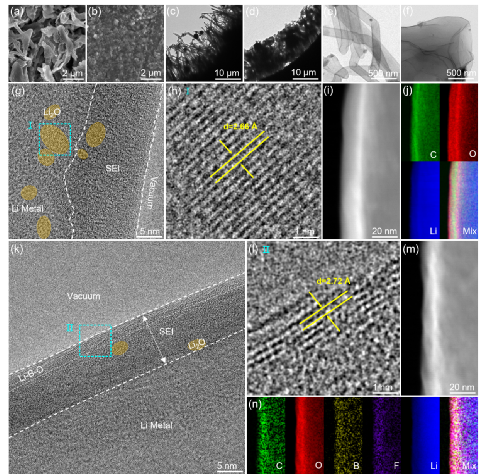 在本研究中,一种先进的电解质使用三种盐溶解在碳酸盐溶剂的组合被开发。盐阴离子主导原生溶剂化鞘层,导致Li+与溶剂之间的弱相互作用,并在原位形成富无机双层固体电解质界面(SEI)。在所设计的电解质中,具有高负载NMC阴极(约20 mg cm - 2)的LMB具有高循环稳定性,在4.5 V的截止电压下,200次循环后的容量保持率为89.89%。低温透射电镜表征(Cryo-TEM)和密度泛函理论(DFT)计算表明,硼酸盐基双层SEI具有异常致密的结构,有效地抑制了锂枝晶的生长,并证明了无机成分的连续性和致密性在SEI中起着至关重要的作用,其重要性超过了吸收和迁移能垒。这种对SEI结构的深刻理解对于推进高稳定LMB的发展具有巨大的潜力,并且可以扩展到其他电池系统。