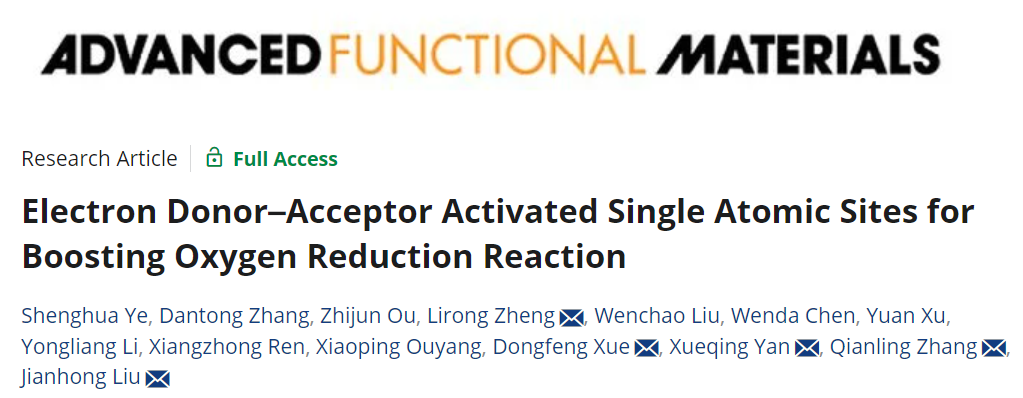2、深圳大学张黔玲教授团队在期刊《Advanced Functional Materials》上发表题为《Electron Donor–Acceptor Activated Single Atomic Sites for Boosting Oxygen Reduction Reaction》的研究论文,深圳大学叶盛华研究员、中国科学院深圳先进技术研究院张丹彤博士是共同第一作者,深圳大学刘剑洪和张黔玲教授、北京大学颜学庆教授、电子科技大学(深圳)高等研究院薛冬峰教授以及中科院高能物理研究所郑黎荣研究员为共同通讯作者。