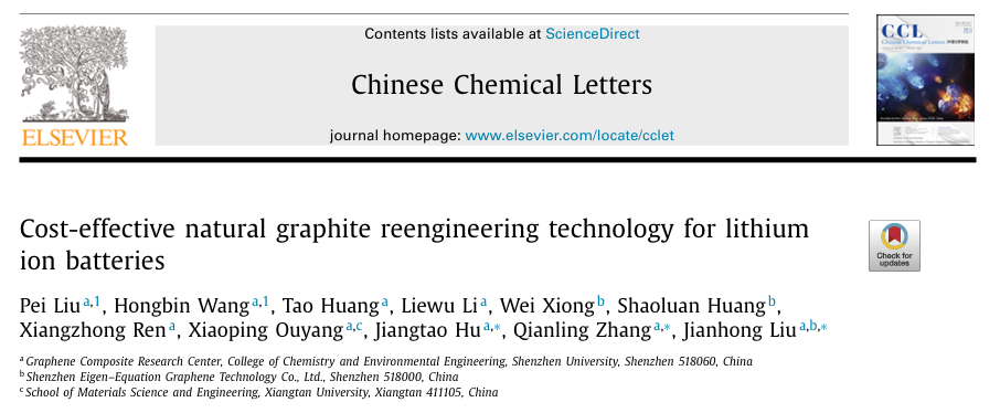 6. 深圳大学化学与环境工程学院张黔玲教授团队在材料领域顶尖期刊《Chinese Chemical Letters》(影响因子6.78,中科院JCR1区)发表了题为《Cost-effective natural graphite reengineering technology for lithium ion batteries》的研究论文。该团队硕士研究生刘珮和黄涛为论文共同第一作者,深圳大学胡江涛/张黔玲/刘剑洪教授为该论文通讯作者。