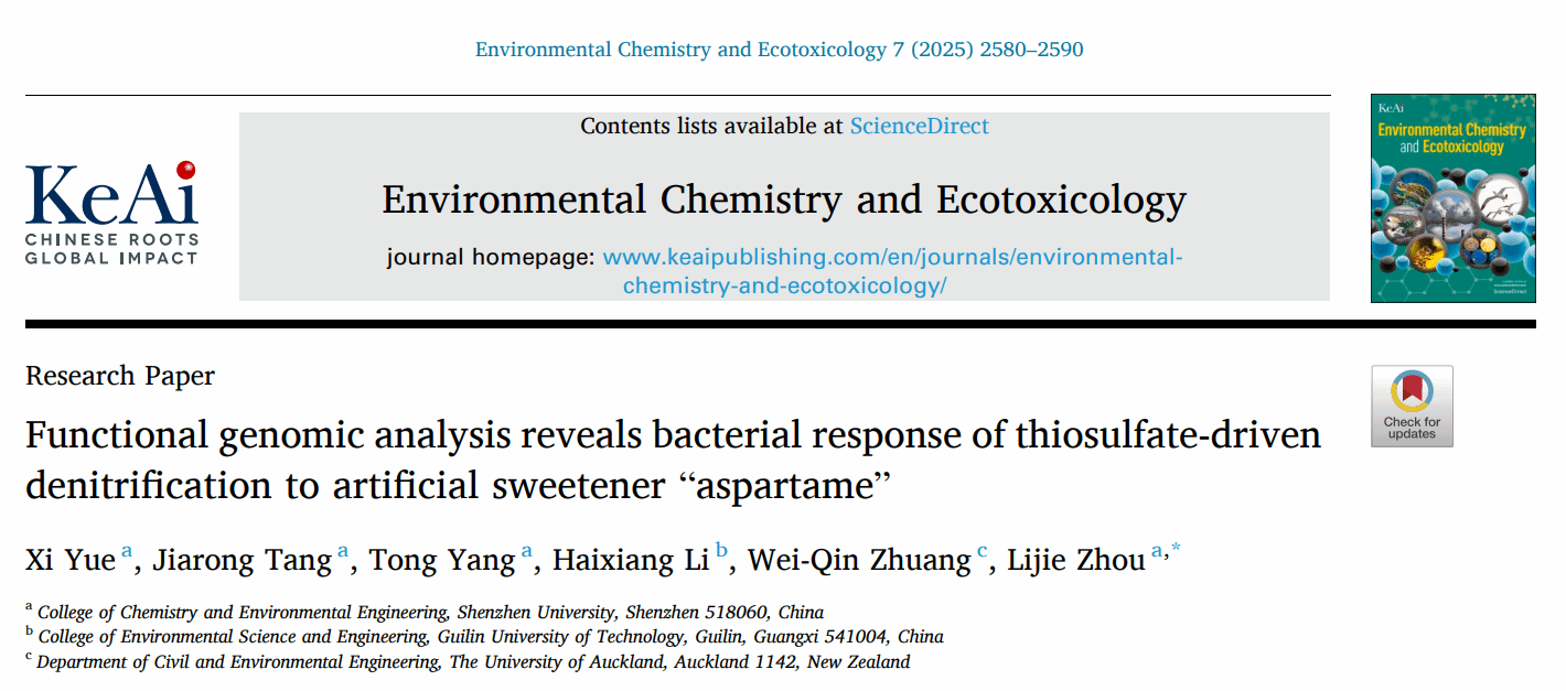 近日,深圳大学化学与环境工程学院周礼杰团队在期刊《Environmental Chemistry and Ecotoxicology》(影响因子8.2,中科院JCR 1区,TOP期刊)上发表了题为《Functional genomic analysis reveals bacterial response of thiosulfate-driven denitrification to artificial sweetener “aspartame”》的研究论文。该团队周礼杰副教授为论文唯一通讯作者,本科生岳熹为论文第一作者,深圳大学为第一作者单位及通讯单位。