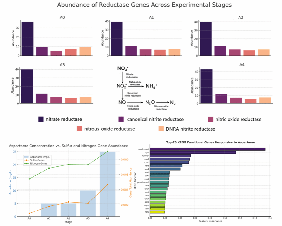 人工甜味剂阿斯巴甜(ASP)因高甜度、低热量等优点被广泛应用于无糖食品和饮料中,随着使用范围的扩大,其在环境中的持久性与生物毒性问题日益受到关注。本研究基于厌氧条件下的硫代硫酸盐供电子反硝化体系,设置0–25 mg/L梯度浓度ASP暴露实验。结果表明,反硝化作用在初期ASP低浓度暴露阶段被短暂抑制,体现为硝酸盐和亚硝酸盐积累,脱氮效率从97%下降到最低78%。然而,系统很快实现了功能恢复,表现出一定的抗扰动能力。在后期较高的ASP负载下,系统也迅速恢复并保持稳定的性能。这种自我修复能力源于以Thiobacillus和Rhodocyclaceae为代表的丰富的核心微生物模块,以及关键氮硫功能基因(如soxB、nar、nir、nos)的表达增强。此外,硫循环与氮循环功能基因之间的紧密协同表达表明,系统内部构建了高度耦合的代谢网络,在应对ASP胁迫时表现出韧性与温稳定性。通过机器学习,进一步识别出了nasC、aprB、soxB和nosZ等是关键的胁迫响应基因,突出了它们在适应性重新编程和生态系统稳健性中的作用。本研究从反应器性能、微生物群落结构、功能基因表达到机器学习多层次揭示了ASP对硫驱动自养反硝化体系的影响,对于理解人工甜味剂类新兴污染物对厌氧生物脱氮过程的影响提供了新的依据,并为工程实践中处理复杂有机物污染提供了理论参考。