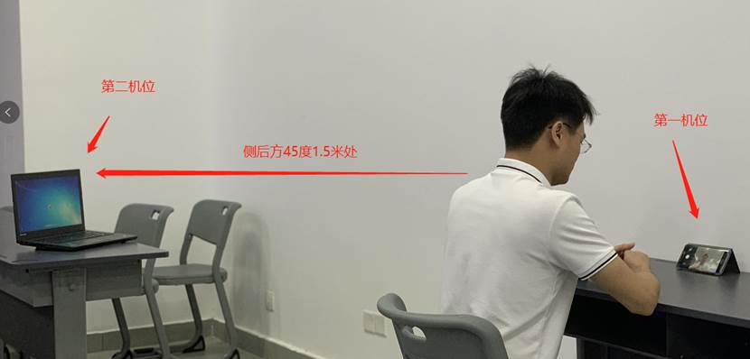 考生自行选择复试场所,要求环境相对安静、独立,光线明亮(不反光);考生复试时需面向墙面(间隔不超过1米),可视范围内不能有任何复试相关参考资料、耳机等设备,应试场所不能有他人在场。第二机位放置于考生侧后方45度1.5米处,可参考下图放置位置。