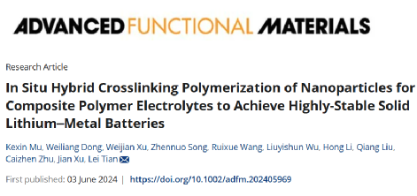Kexin Mu, Weiliang Dong, Weijian Xu, Zhennuo Song, Ruixue Wang, Liuyishun Wu, Hong Li, Qiang Liu, Caizhen Zhu, Jian Xu, and Lei Tian*, In Situ Hybrid Crosslinking Polymerization of Nanoparticles for Composite Polymer Electrolytes to Achieve Highly-Stable Solid Lithium–Metal Batteries. Adv. Funct. Mater. 2024, 2405969