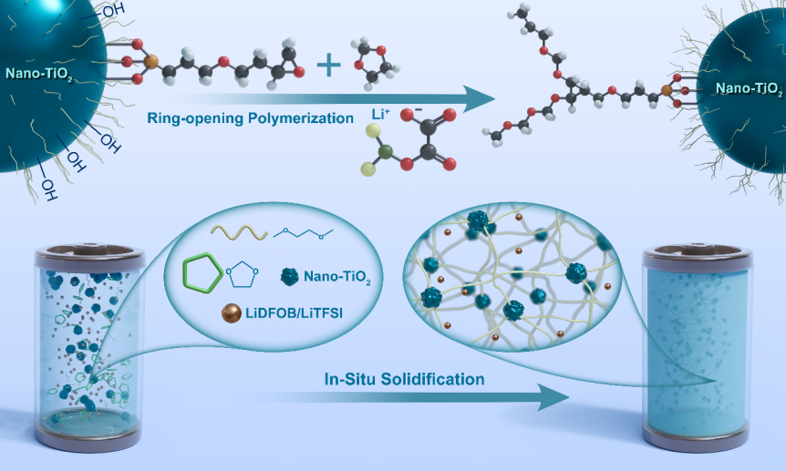 Figure 1. Design and fabrication of nanoparticle hybrid crosslinked composite polymer electrolyte via in situ solidification. Schematic diagram of in situ polymerization design of nanoparticle hybrid crosslinked solid polymer electrolyte.