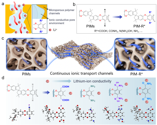 Figure 1. The design of porous polymer electrolyte (PIM-CONH2) and understanding of its microporous microenvironment. (a) Schematic diagram of ion transport in the microporous environment. (b) Synthetic routes of PIM polymers. (c) Schematic diagram of the comparison of the microporous microenvironment of PIMs electrolytes before and after modification. (d) Different structural PIMs molecular configurations and lithium ion coordination sites.
