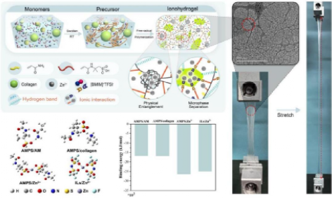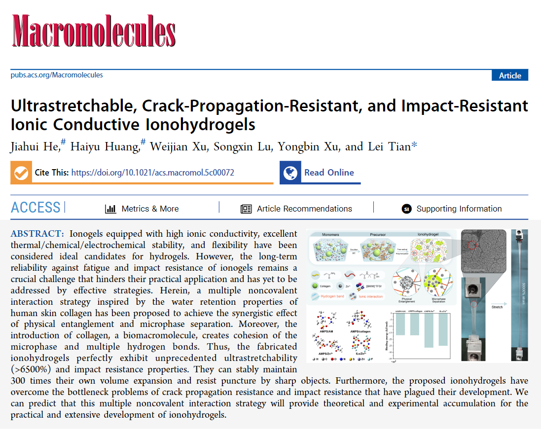 Recently, the research group led by Professor Lei Tian from the College of Chemistry and Environmental Engineering at Shenzhen University, inspired by the water-retention properties of collagen in human skin, proposed a multi-non-covalent interaction strategy to achieve synergistic effects of physical entanglement and microphase separation. In addition, the introduction of collagen, a biological macromolecule, generated cohesive forces within the microphases and multiple hydrogen bonds. The resulting ionic hydrogel exhibits unprecedented properties, including ultra-stretchability (>6500%), impact resistance, and excellent ionic conductivity (2.18 mS/cm). It can stably maintain swelling up to 300 times its own volume and resist puncture by sharp objects. This work, titled "Ultrastretchable, Crack-Propagation-Resistant, and Impact-Resistant Ionic Conductive Ionohydrogels," has been published in 《Macromolecules》. The first authors of the paper are Master's students Jiahui He and Haiyu Huang, both in their first year of graduate study.