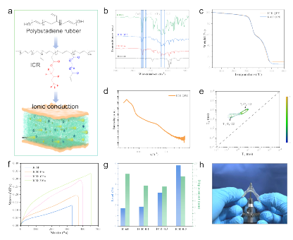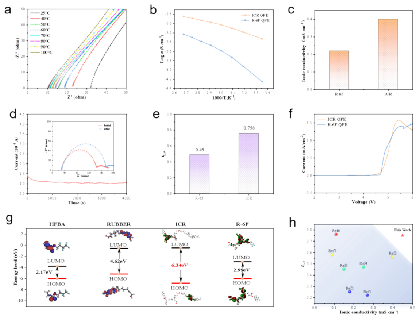 Figure 6. Li⁺ transport properties and electrochemical characteristics of ICR QPE. (a) Impedance plots of ICR QPE at different temperatures. (b) Arrhenius plots of ionic conductivity for ICR QPE and R-6F QPE. (c) Bar chart comparing the ionic conductivity of ICR QPE and R-6F QPE at room temperature. (d) Polarization curve of Li|ICR QPE|Li battery and initial/steady-state impedance plots. (e) Bar chart comparing the lithium-ion transference numbers of ICR QPE and R-6F QPE. (f) LSV curves of ICR QPE and R-6F QPE. (g) HOMO and LUMO energy levels of HFBA, pure rubber, ICR QPE, and R-6F. (h) Comparison of ionic conductivity and conductivity between ICR QPE and other materials.