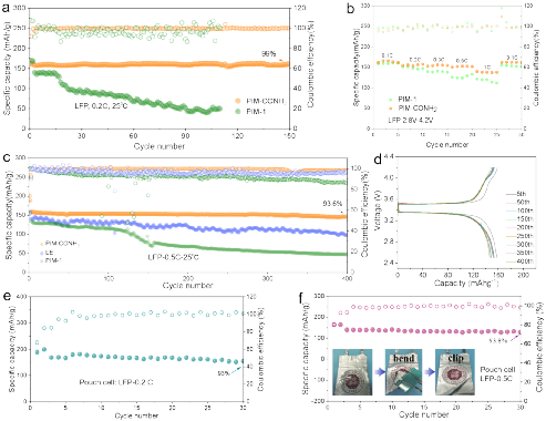 Figure 2. Performance of Solid-State Lithium Metal Batteries. (a) The cycling performance of LFP|PIM-1|Li, LFP|PIM-CONH2|Li at 0.2 C rate and 25℃. (b) Rate performance of LFP|PIM-1|Li and LFP|PIM-CONH2|Li. (c) The cycling performance of LFP|PIM-1|Li, LFP|PIM-CONH2|Li, and LFP|LE|Li at 0.5 C rate and 25℃. (d) Charge discharge curves of LFP|PIM-CONH2|Li at 0.5 C and 25℃. (e) The cycling performance of LFP|PIM-CONH2|Li pouch cells at 0.2 C and 25℃. (f) The cycling performance of the LFP|PIM-CONH2|Li pouch cell after folding and cutting under the conditions of 0.5 C rate and 25°C.