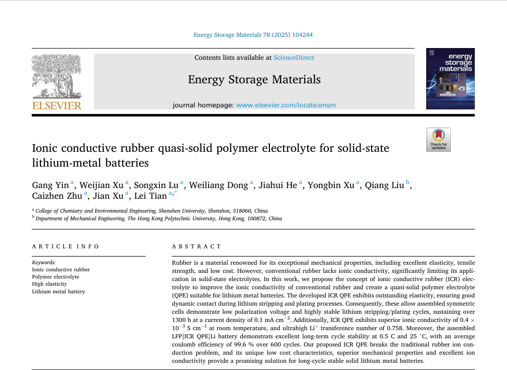 Recently, the ICR QPE polymer electrolyte developed by Professor Tian Lei's research group at Shenzhen University demonstrated remarkable elasticity, ensuring excellent dynamic contact during lithium stripping and plating processes. As a result, the assembled symmetric cells exhibited low polarization voltage and highly stable lithium stripping/plating cycles, maintaining performance for over 1,300 hours at a current density of 0.1 mA cm⁻⟡. Additionally, the ICR QPE exhibited an ionic conductivity of 0.4×10⁻³ S cm⁻¹ at room temperature and an ultrahigh Li⁺ transference number of 0.758. Furthermore, the LFP|ICR QPE|Li cell assembled with this electrolyte showed excellent long-term cycling stability at 0.5 C and 25 °C, achieving an average Coulombic efficiency of 99.6% after 600 cycles. The proposed ICR QPE overcomes the traditional challenges of rubbery ion conduction, and its unique low-cost characteristics, superior mechanical properties, and outstanding ionic conductivity provide a promising solution for long-cycle-stable solid-state lithium metal batteries. This work has been published in the international top-tier journal 《Energy Storage Materials》, with Yin Gang as the first author.