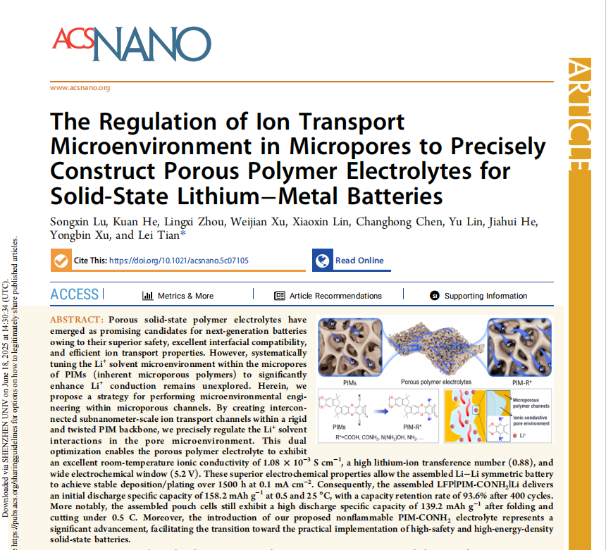The relevant research achievements were published in the top international journal《ACS Nano》under the title "The Regulation of Ion Transport Microenvironment in Micropores to Precisely Construct Porous Polymer Electrolytes for Solid-State Lithium-Metal Batteries." Lu Songxin, a first-year graduate student, is the first author of the paper.