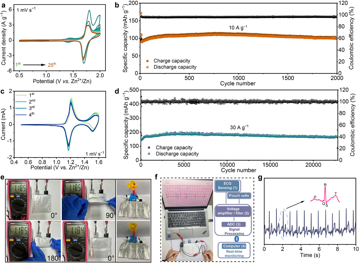 Flexible pouch cells based on TCE also exhibited stable output voltages under bending angles of 0°, 90°, and 180°, demonstrating excellent mechanical reliability. The team further used the pouch cell to power a wireless electrocardiogram (ECG) monitoring system, successfully achieving real-time signal acquisition and display. This result highlights the promise of TCE-based batteries for flexible electronics and wearable healthcare devices.