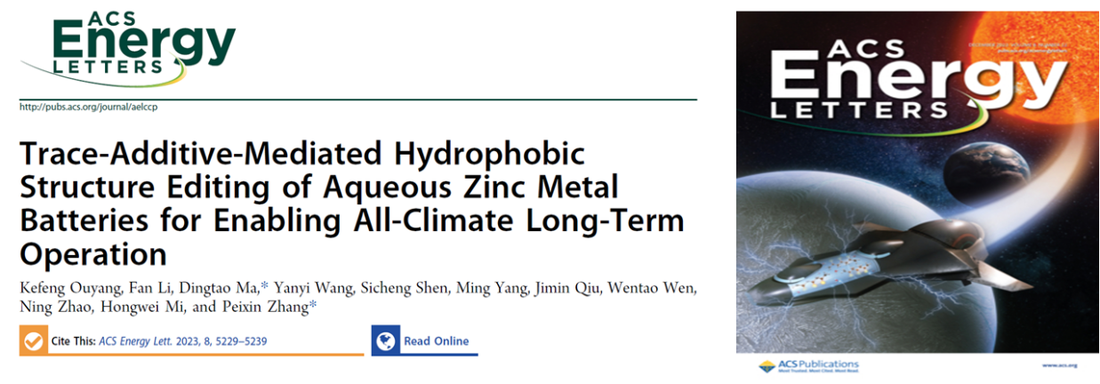 To solve the problems of slow Zn2+ transport kinetics and thermodynamic instability at the electrolyte-electrode interface, the concept of trace additive-mediated editing of hydrophobic structures was proposed, to reconstruct the Zn2+ solvated structure and achieve in situ self-assembly electrode-electrolyte interfaces by adding polyacrylic acid (PAA) to the aqueous electrolyte. The reconstructed Zn2+ hydrated structure has fast reaction kinetics, while the electrode surface interfacial layer greatly improves the thermodynamic stability of the aqueous Zn metal batteries, thus realizing long-term operation over a wide temperature range. The results were published as a cover paper in ACS Energy Letters (2023, 8:5229), a highly-ranked journal with a journal impact factor of 22.0. The co-first authors are graduate students Kefeng Ouyang and Fan Li, Prof. Peixin Zhang and Associate Researcher Dingtao Ma are the co-corresponding authors, and Shenzhen University is the first corresponding affiliation and sole correspondent.