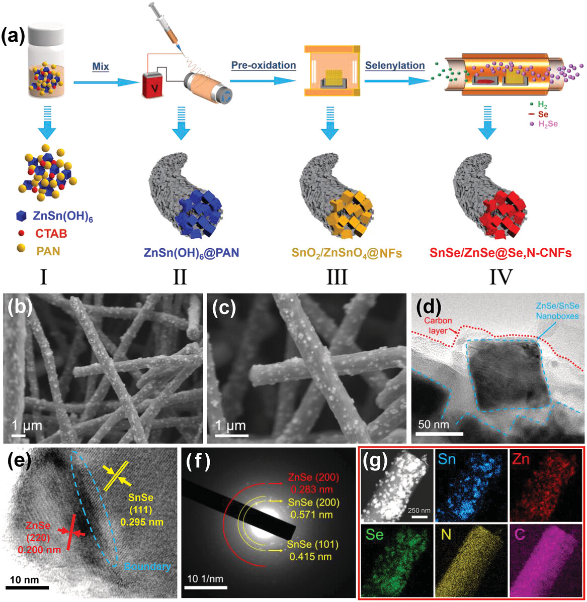 In this article, ZnSn(OH)6 nanobox precursors were first electrospunned with polyacrylonitrile (PAN) to obtain a 3D free-standing network, after thermal treatments with carbonization and selenylation, ZnSe/SnSe heterostructures embedded in the Se/N co-doped CNF skeleton have been developed (ZnSe/SnSe@Se,N-CNFs). The unique ZnSe/SnSe heterostructures, electrospun CNF and Se/N co-doped characteristics can effectively promote electron/Na+ diffusion rate, enhance the structure stability, and accelerate the electrochemical reaction kinetics: I) The hetero-boundaries in the ZnSe/SnSe will provide enhanced interfacial coupling effect and built-in electric field with additional charge-transfer driving force, which can attract more Na+ ions to adsorb in the heterogeneous interfaces and improve the migration rate of Na+ ions from electrolyte to electrode, thereby effectively accelerating the electrochemical kinetics. II) The 3D free-standing CNF network embedded with ZnSe/SnSe nanoboxes, can not only enhance the conductivity of semiconductor ZnSe/SnSe but also improve its structure integrity avoiding violent volume expansion/shrinkage during the insertion/extraction process. III) The Se/N co-doping feature achieves a coupling effect between the CNF matrix and the selenide heterostructures, enabling fast ion/electron transport and accelerating surface/internal reaction kinetics for Na-ion storage, and enhancing the electronic conductivity and wettability of the CNF matrix. This research gives some inspiring design ideas for addressing the current challenges of alloy-based materials when applying in sodium-ion batteries: The electrical conductivity has been enhanced by hetero-nanostructure construction, carbon-shell coating, and co-doping modification strategies; and volume expansion issue has been addressed by embedding alloyed materials into carbon matrix with 3D free-standing skeleton feature.