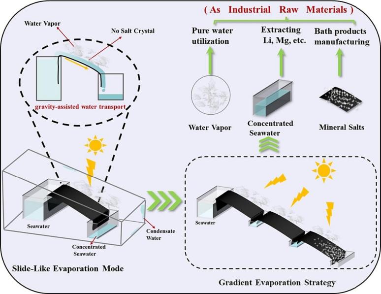 Solar-driven Interfacial Evaporation (SDIE) is a promising green technology with great potential for seawater desalination. In this study, a novel slide-like cotton-based solar evaporator is designed using Carbon Nanotubes (CNTs) and Musou Black (MB) in an inclined mode, achieving a fast capillary force-induced gravity-assisted water transport. The evaporator achieved a stable desalination of the concentrated brine (10.0 wt% NaCl solution) at the evaporation rate of 1.44 kg m-2 h-1 under one simulated sunlight (1 KW m-2). Adequate water supply facilitated a superior self-cleaning property without salt aggregation at the evaporation surface and its periphery. In the 10-day long-term evaporation (3.5 wt% NaCl solution), a stable water evaporation rate (1.77 kg m-2 h-1) and a light-to-heat conversion efficiency (95.47%) were obtained without salt aggregation. The evaporation rate could even reach 1.88 kg m-2 h-1 in a closed evaporation system outdoors under the practical light. Then, the gradient evaporation strategy was applied by combination of the slide-like solar evaporators consecutively in three stages, in-between which two collection tanks for the concentrated seawater were present. As the concentrated seawater can be used to extract Li, Mg, etc., and the mineral salts of the sea can be used for nutrients, bathing products, etc., the gradient evaporation strategy has realized the simultaneous derivation of the condensed pure water, the concentrated seawater with different concentrations, and the mineral salts at the last stage as industrial raw materials. This study provides new insights into the design of high-efficiency solar evaporators that can comprehensively realize the utilization of seawater resources.