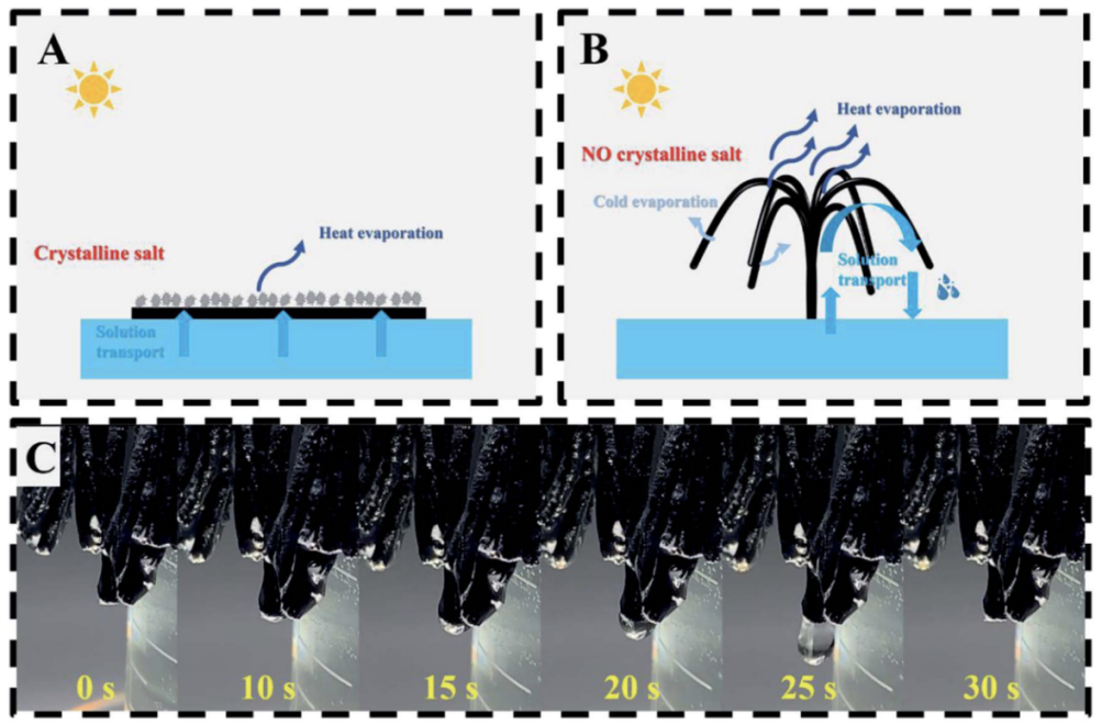 A new hydrogel-based solar evaporator was prepared by a convenient one-step cross-linking method. Sodium alginate and PEDOT:PSS composite hydrogels were used as the functional layer to realize photothermal conversion and in situ heating for the generation of the solar steam. The evaporation rate of the evaporator was as high as 1.23 kg m-2 h-1, and the removal rate of various ions in simulated seawater was higher than 99.8%, showing excellent application stability. It was also found that the salt crystallization phenomenon could be effectively overcome in the process of solar desalination. Based on the swelling ability and super hydrophilic three dimensional pores of the ionic hydrogel, the evaporator exhibited stable self-driven water-drawing ability to form a hydration layer in an effort to suppress the supersaturation of the salt solution at the evaporation interface. PEDOT component realized in situ heating of the hydration layer near the evaporation interface for enhancing the utilization of thermal energy. The purpose of this paper is to provide references for the practical desalination application using a new hydrogel-based solar evaporator.