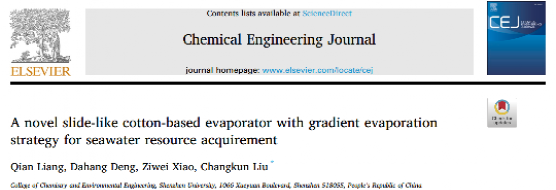 The research paper titled "A novel slide-like cotton-based evaporator with gradient evaporation strategy for seawater resource acquirement" is authored by Master student Qian Liang as the first author and Associate Professor Changkun Liu as the corresponding author. The affiliations of both the first author and the corresponding author are Shenzhen University. This paper was published in Chemical Engineering Journal, which has an impact factor of 13.3 (at the accepted/publication date) and is listed as Tier 1 journal as categorized by the Chinese Academy of Sciences.