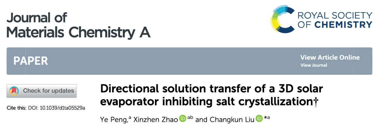 The research paper titled "Directional solution transfer of a 3D solar evaporator inhibiting salt crystallization" is authored by Master student Ye Peng as the first author and Associate Professor Changkun Liu as the corresponding author. The affiliations of both the first author and the corresponding author are Shenzhen University. This paper was published in Journal of Materials Chemistry A, which has an impact factor of 14.5 (at the accepted/publication date) and is listed as Tier 1 journal as categorized by the Chinese Academy of Sciences.