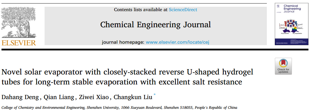 The research paper titled "Novel solar evaporator with closely-stacked reverse U-shaped hydrogel tubes for long-term stable evaporation with excellent salt resistance" is authored by Master student Dahang Deng as the first author and Associate Professor Changkun Liu as the corresponding author. The affiliations of both the first author and the corresponding author are Shenzhen University. This paper was published in Chemical Engineering Journal, which has an impact factor of 15.1 (at the accepted/publication date) and is listed as Tier 1 journal as categorized by the Chinese Academy of Sciences.