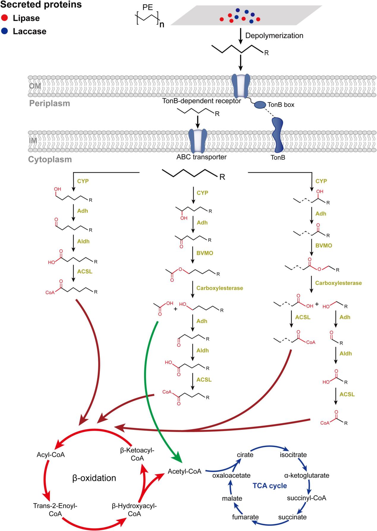 Based on the potential PE-degrading genes carried by MAG10, this study proposes a new approach for the microbial consortium to degrade PE plastic synergistically. Alkanes first enter the periplasm through the TonB system and then enter the cytoplasm via ABC transporters in the bacterial inner membrane. AlkB is also an inner membrane protein that can act as a carrier protein to transport alkanes and catalyze the conversion of alkanes into alcohols. However, MAG10 does not encode AlkB, so the hydroxylation of alkanes may be carried out by cytochrome P450. Unlike AlkB, which can only hydroxylate terminal and subterminal alkanes, cytochrome P450 can hydroxylate alkanes at different carbon positions (terminal, subterminal, and chain-middle). Therefore, after alkanes are hydroxylated by cytochrome P450 in MAG10, they are subsequently converted into primary and secondary alcohols. Primary and secondary alcohols are oxidized to acetic acid and long-chain fatty acids through a series of cascade enzyme-catalyzed reactions inside the cell. The generated acetic acid and long-chain fatty acids are respectively synthesized into acetyl-CoA and acyl-CoA, which then enter the TCA cycle and β-oxidation cycle respectively. Finally, the metabolic products and biodegradation products of PE are assimilated or mineralized into biomass, CO₂ and H₂O through intracellular enzymatic pathways.
