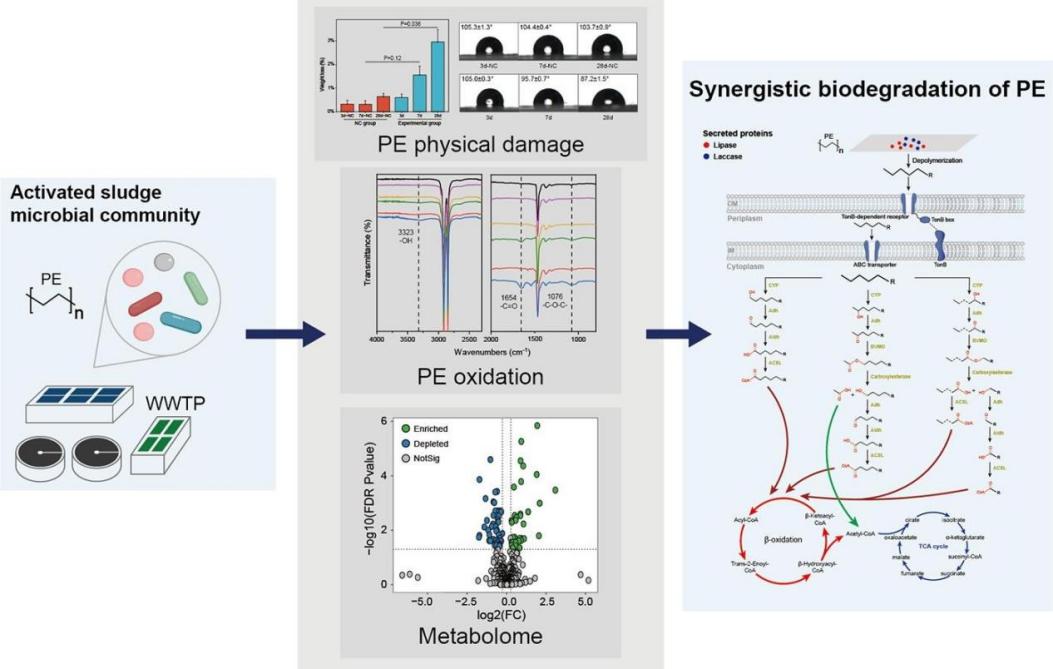 Facing the increasingly severe global plastic pollution challenge, especially the issue of microplastic (MPs) pollution, microbial degradation is one of the sustainable solutions. A key factor in promoting the development of this technology is to explore highly efficient plastic-degrading microorganisms in different habitats. Among them, activated sludge has attracted much attention because it contains a microbial community occupying diverse ecological niches. In this study, polyethylene (PE) plastic was used as a carbon source to enrich and culture the activated sludge microbiota to screen for microbial communities capable of degrading PE. After 28 days of enrichment culture, the weight loss of the PE film reached 3%, and its hydrophobicity decreased. Meanwhile, Fourier-transform infrared spectroscopy (FTIR) results showed that multiple new oxygen-containing functional groups were formed on the PE surface. Microbial analysis extracted 26 metagenome-assembled genomes (MAGs) from the enriched microbial communities. Among them, MAG10, MAG21 and MAG26 increased significantly in abundance after PE addition and were rich in genes related to carbohydrate transport and metabolism. Functional analysis further identified 14 plastic-degrading-related functional genes, including oxidases, laccases and lipases, suggesting that this microbiota has the potential to degrade PE.