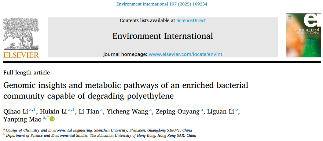 Recently, Associate Professor Yanping Mao's team from the College of Chemistry and Environmental Engineering at Shenzhen University published the latest research progresses 《Genomic insights and metabolic pathways of an enriched bacterial community capable of degrading polyethylene》 on journal《Environment International》(2023 IF: 10.3; 5 year IF: 11.2).