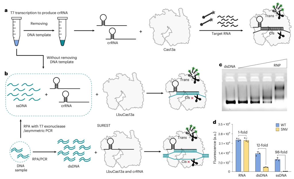 The SUREST technology integrates recombinase polymerase amplification (RPA) with the strong trans-cleavage activity of LbuCas13a to achieve extremely high detection sensitivity. The sensitivity for detecting the CYP2C19 gene (rs4986893) reaches 0.3 aM (0.18 copies/μL), and it can complete the quantitative analysis of hepatitis B virus and HPV16 virus within more than 20 minutes, with a detection limit as low as 1 aM.