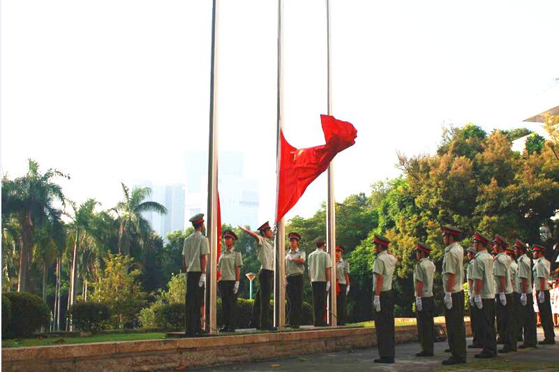 凌晨7点10分的时候,全院的师生就已经集合完毕,静候庄严的升国旗仪式开始。7:30分,国旗护卫队手执鲜红的五星红旗整齐划一的向主席台前进,升旗手接过国旗,雄壮的《义勇军进行曲》激昂奏响,五星红旗缓缓升起,全体师生立正行注目礼。