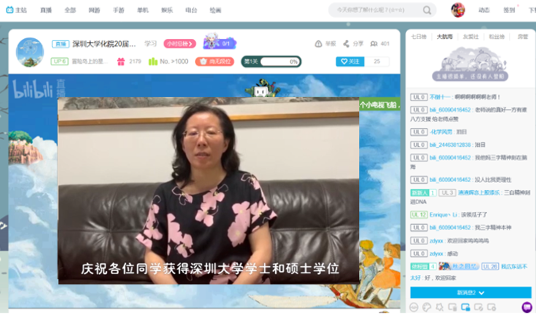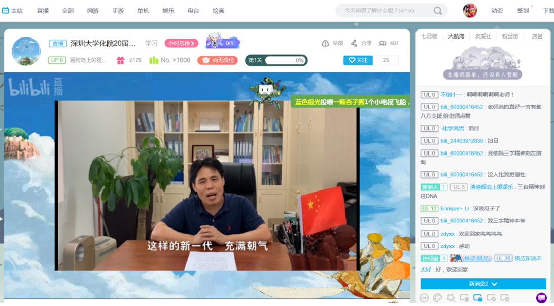 2020年6月14日晚,深圳大学化学与环境工程学院第2020届毕业晚会——冒险岛上的星期天,在网络直播平台哔哩哔哩动画顺利举行。综合考虑防疫要求,为了减少人群聚集,本次晚会突破性地采用了预先录制、线上直播、远程与会的创新模式。同时,开放式的直播间亦使更多人员的在线观看和积极参与成为可能。